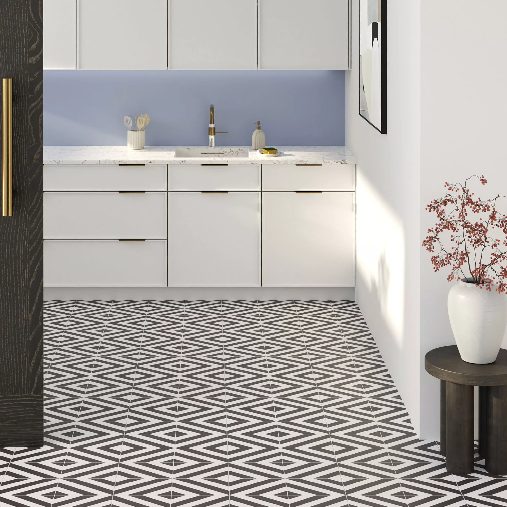 El suelo laminado Black&White Pattern Tile, un diseño atractivo con un toque retro y elegante. Su fuerza y atractivo son innegables, ya que su simple presencia aporta personalidad a cualquier espacio.