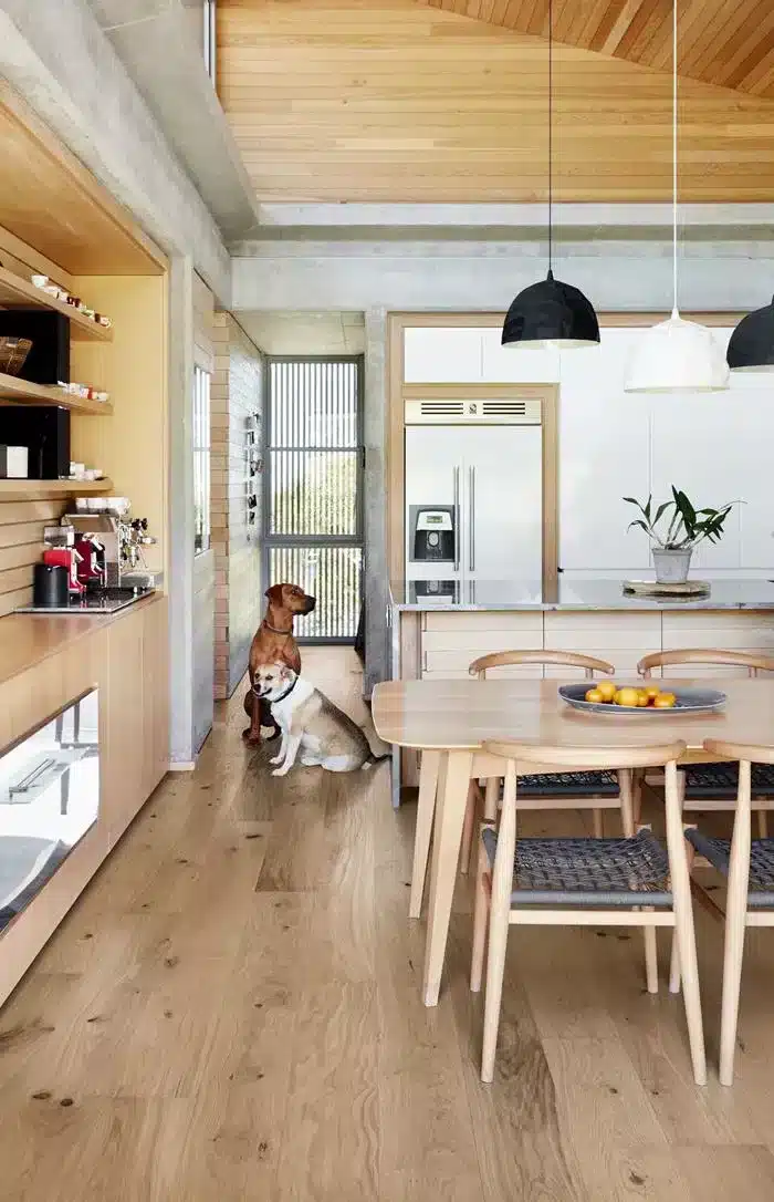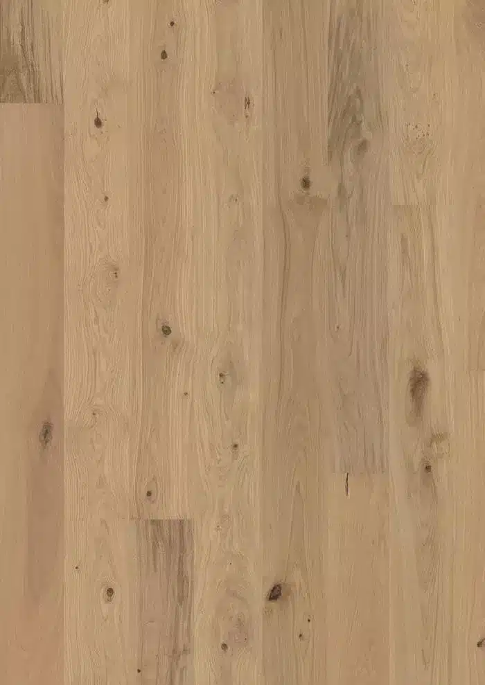 El modelo Oak Gentian presenta un ligero lavado blanco con un ligero matiz grisáceo que armoniza las vetas, nudos y grietas más oscuras de la madera con el color general de la madera teñida. Esto evoca un diseño elegante y moderno, a la vez que conserva la calidez del roble. La superficie lacada mate está cepillada para realzar aún más la textura de la veta de la madera, permitiendo que el patrón creado por la naturaleza cobre vida.