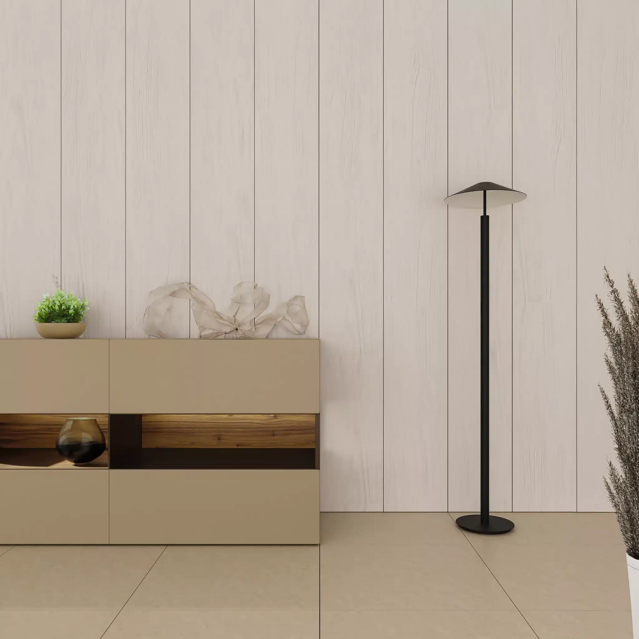 Revestimiento decorativo roble claro con un sutil mallado, tiene acabado liso. Son lamas anchas de 325mm que se unen mediante su machihembrado dejando un pequeño rebaje que le da un toque de diseño y elegancia a la estancia.