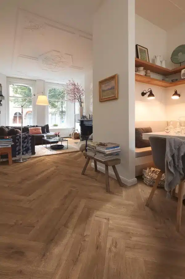 En espiga con patrón de colocación clásico en el que las lamas cortas de parquet se colocan formando un ángulo de 90°, imitando la forma de una espiga.