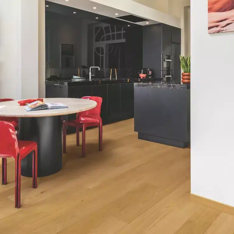 La colección de tarima flotante Amato de Quick Step es acogedora, única e impermeable. Estos suelos de madera resistentes al agua son un sueño para caminar, ya que combinan sin esfuerzo la durabilidad con la belleza natural. Exactamente el tipo de sofisticación que merece tu hogar y adecuado para cualquier habitación, incluidas cocinas y baños.