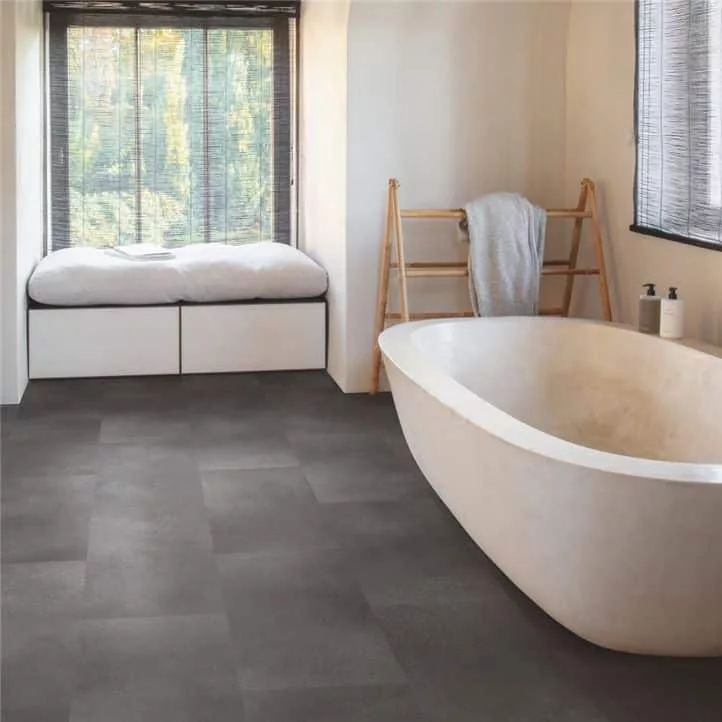 Solución de suelo total de baldosas de vinilo herméticas con una capa de subsuelo fijada. Ideal para una para una instalación de clic rápida y sencilla, incluso en subsuelos irregulares.